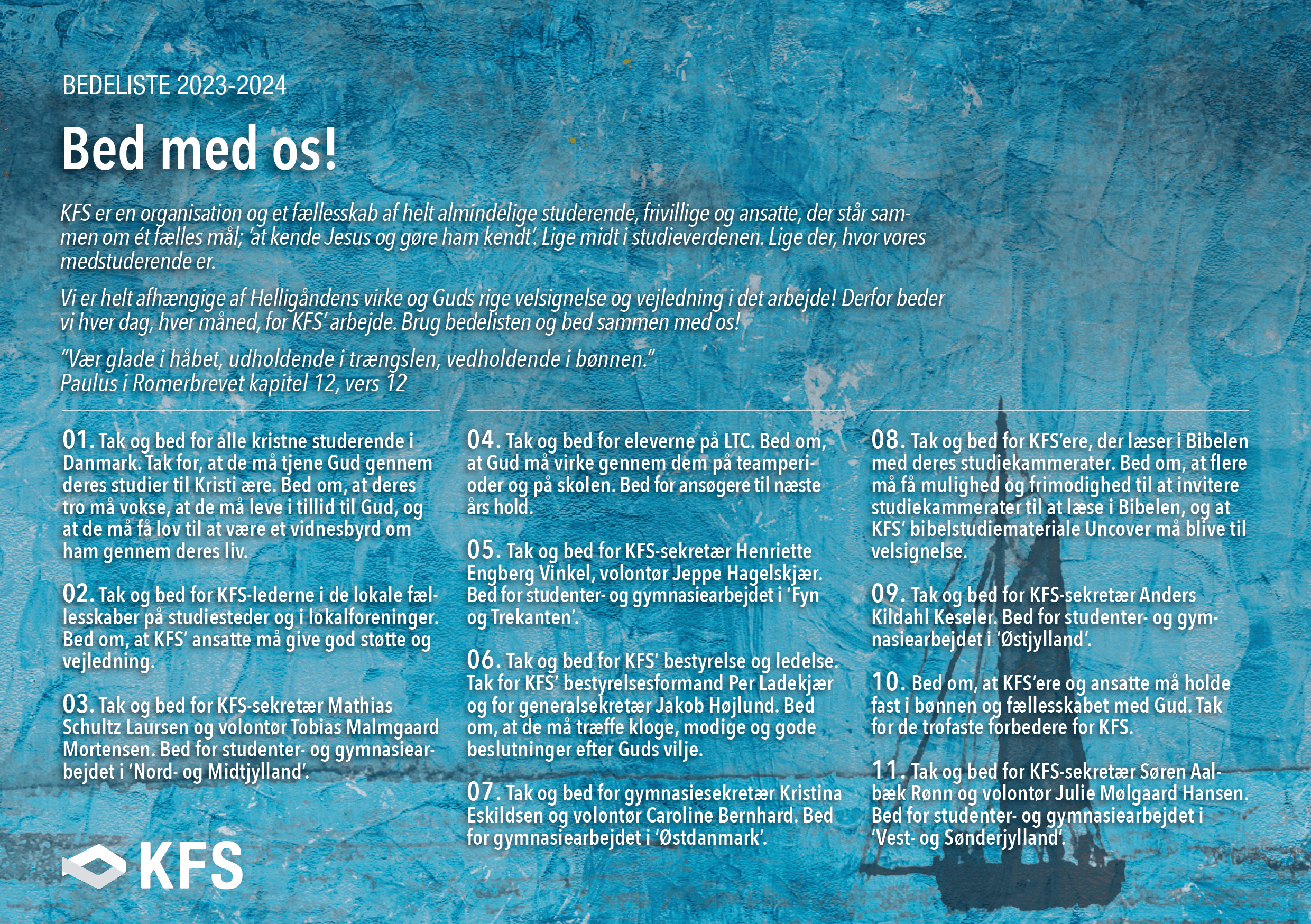 Vi er helt afhængige af Helligåndens virke og Guds rige velsignelse og vejledning i det arbejde! Derfor beder vi hver dag, hver måned, for KFS’ arbejde. Brug bedelisten og bed sammen med os!